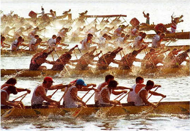 “虎符缠臂,佳节又端午。门前艾蒲青翠,天淡纸鸢舞。粽叶香飘十里,对酒携樽俎。龙舟争渡,助威呐喊,凭吊祭江诵君赋”(苏轼《六幺令·天中节》)——写出了我国极具特色的端午节民俗文化。