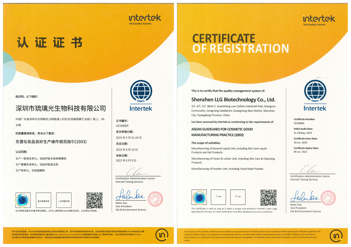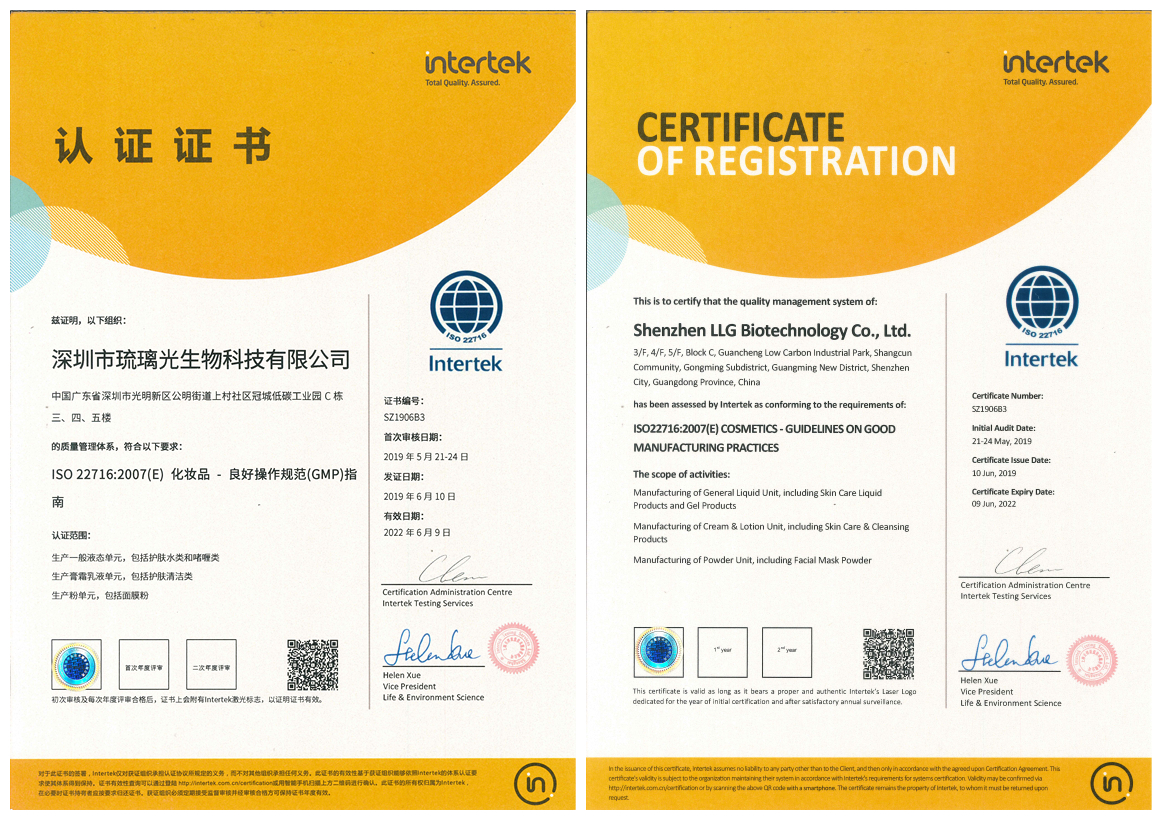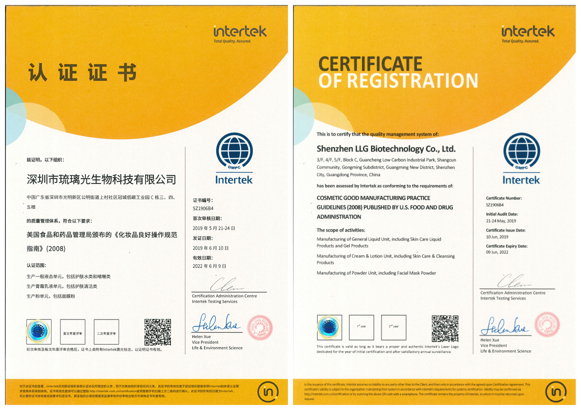 2019年6月,赛因诗婷品牌工厂深圳市琉璃光生物科技有限公司通过 ISO 22716体系认证、美国GMPC体系认证和东盟GMPC体系认证。